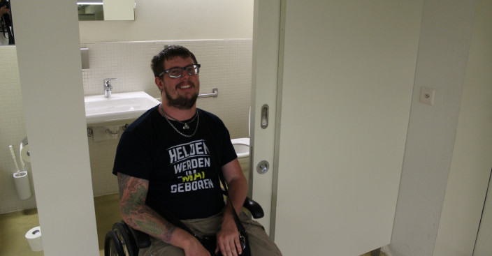 L’école cantonale d’Aarau a un restaurant. Dans ce restaurant, il y a des toilettes pour personnes en fauteuil roulant. Mais les personnes en fauteuil roulant ne pouvaient pas les utiliser. Nous avons rendu l’accès aux toilettes plus facile. Nous vous expliquons comment.